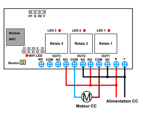 3) Raccorder les deux fils du moteur CC ou de l’actionnaire linéaire aux deux terminaux "COM" de l’interrupteur WiFi "OUT1" et "OUT2" Vous pouvez modifier ces deux lignes pour changer le sens de travail du moteur ou de l’actionnaire linéaire.