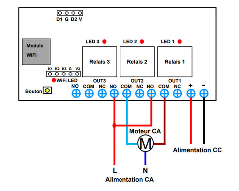3) Connectez respectivement les fils avant et arrière du moteur CA aux deux terminaux "COM" de l’interrupteur WiFi "OUT1" et "OUT2" Vous pouvez modifier ces deux lignes pour changer le sens de fonctionnement du moteur.