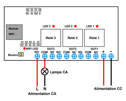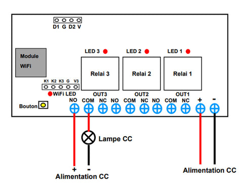 2. Lors de l'utilisation d'un troisième relais pour contrôler une lampe CC, connectez-vous comme indiqué ci-dessous: