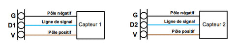 Connectez le pôle positif, le pôle négatif et la ligne de signal des deux interrupteurs de capteur aux deux terminaux "V", "G" et "D" respectivement, comme indiqué ci-dessous: