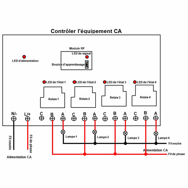 Remarque: Le récepteur est la sortie de relais, pas la sortie de alimentation CC/CA. Etat initial de bornes de sortie de relais: Les bornes A et B sont Normalement Ouvert; Les bornes A et C sont Normalement Fermé.