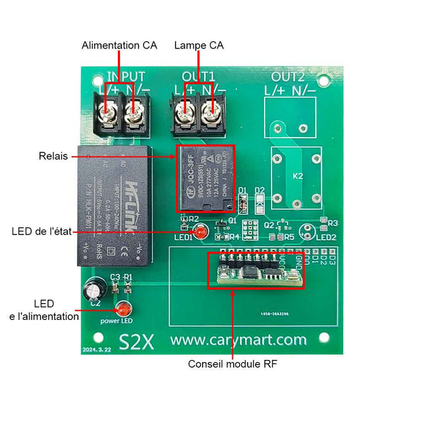 Relâchez le bouton: Les borne SORTIE du récepteur arrêtent de sortir, et la lampe connectée est éteint.