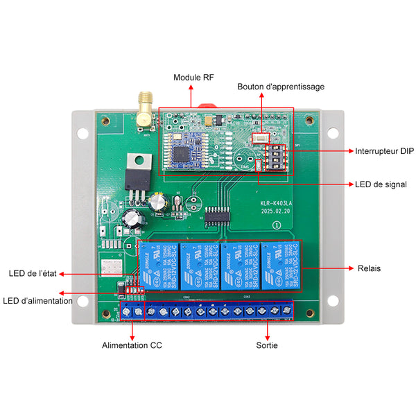 Sortie Relais: Ce récepteur est le sortie relais sec, il peut être utilisé pour contrôler à la fois les équipements CC et AC. Les bornes de sortie sont NO / NC (normalement ouvert / normalement fermé), qui sert d'interrupteur.