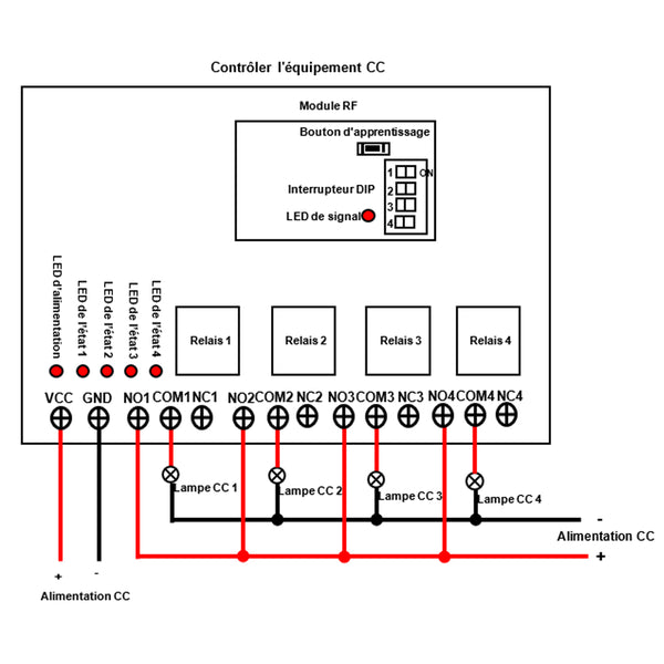 1) Connecter le pôle positif de l'alimentation en CC à la bornes « VCC » du interrupteur sans fil;