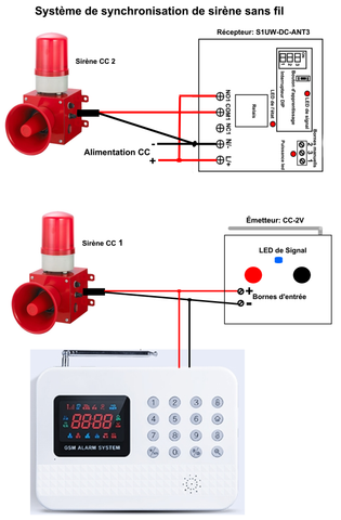 Quand la sirène CC est allumée, l'émetteur émet automatiquement un signal sans fil "ON". Lorsque le récepteur reçoit ce signal sans fil, il va allumer une autre sirène CC.